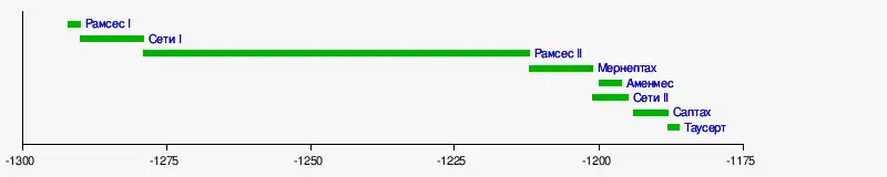 Мернептах (1212—1202 годы до н. э.) — один из множества сыновей Рамсеса II, стал фараоном лишь в 60 лет. Отразил одно из первых нашествий «народов моря». Мернептаху наследовал его сын Сети II (1202—1195 годы до н. э.), во время правления которого трон был узурпирован Аменмесом (1200—1196 годы до н. э.), предположительно внуком Рамсеса II. После смерти Сети II трон унаследовал его сын Саптах (1194—1188 годы до н. э.), при регентстве своей мачехи Таусерт, ставшей после смерти Саптаха последним фараоном XIX династии (1188—1186 годы до н. э.). Правила она недолго, и с её смертью началась анархия, в ходе которой к власти пришла XX династия.