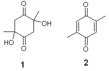 При действии разбавленной щёлочи образуется 2,5-дигидрокси-2,5-диметил-1,4-циклогександион (1), в концентрированной щёлочи образуется п-ксилохинон (2).