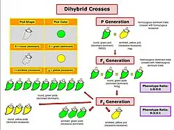 Дигибридное скрещивание — скрещивание организмов, отличающихся по двум парам альтернативных признаков, например, окраске цветков (белая, смешанная или окрашенная) и форме семян (гладкая или морщинистая).