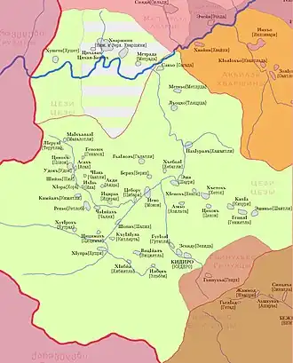Дидойские сёла в горной зоне. Названия приведены на цезском языке.