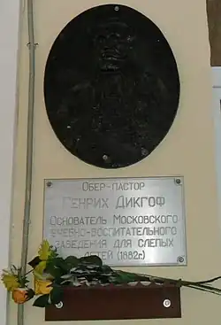 Будучи обер-пастором евангелическо-лютеранской церкви свв. Петра и Павла, Генрих Дикгоф выступил инициатором создания учреждения нового типа для слепых детей. Еще в юности он поддерживал начинания глухого единоверца Ивана Карловича Арнольда, всячески помогая тому открыть в Москве школу для глухих детей.