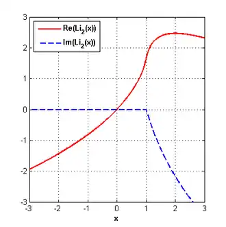 Приведённое определение дилогарифма верно для комплексных значений переменной . Для действительных значений у этой функции есть разрез вдоль действительной оси от до . Обычно значение функции на разрезе определяется так, что мнимая часть дилогарифма отрицательна: