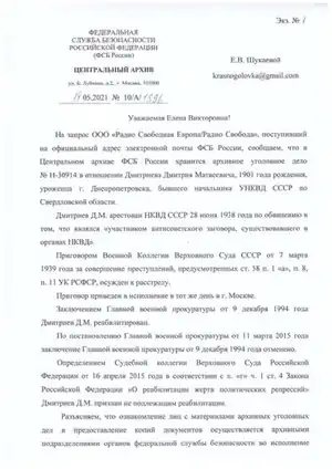 Реабилитирован 9 декабря 1994 года ГВП РФ года, невзирая на явное участие в репрессиях[9]. Постановлением Главной военной прокуратуры от 11 марта 2015 года заключение Главной военной прокуратуры от 9 декабря 1994 года было отменено. Определением Судебной коллегии по делам военнослужащих Верховного суда Российской Федерации от 16 апреля 2015 года Д.М. Дмитриев был признан не подлежащим реабилитации.