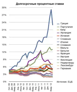 Европейский долговой кризис[4], или кризис суверенного долга в ряде европейских стран[5] — долговой кризис, охвативший в 2010 году сначала периферийные страны Евросоюза (Греция, Ирландия), а затем распространившийся практически на всю зону евро[6]. Источником кризиса называют кризис рынка гособлигаций в Греции осенью 2009 года[7]. Для некоторых стран еврозоны стало сложным или невозможным рефинансирование государственного долга без помощи посредников[8].