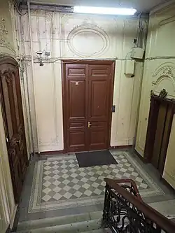 Для отделки здания применялись только качественные и дорогостоящие материалы. Например, витражи для оформления вестибюлей и лестничных пролётов были созданы на заказ в мастерской торгового дома «М. Франк и К°»[8]. Полы в общественных зонах выложены метлахской плиткой, колонны и лестницы облицованы мрамором, потолки и стены оформлены лепниной, поставлены резные дубовые двери и высокие зеркала[3].