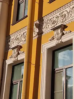 Фасады со временем были изменены. Фасад на улицу Чайковского обработан карнизом на кронштейнах и аттиком, что типичнее для позднего классицизма. Наличники второго этажа, лепные панно с акантами и горельефы женских голов более типичны для русского классицизма конца XVIII — начала XIX веков[1].