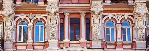Балконы внутри портиков фланкированы малыми колоннами. Портал центрального входа завершен волютами, помещенными в плоскую сложнопрофилированную нишу параболического абриса. Фигуры атлантов, кариатид и другие орнаментальные рельефы и детали скульптурного декора отличаются мастерством исполнения. Капители имеют оригинальную форму с мотивами фауны.[3]