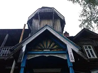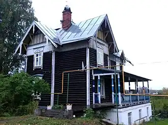 Двухэтажный деревянный дом установлен на кирпичный фундамент-цоколь. Несколько срубов и наличие башни-обсерватории создают эффект многообъемности с осевой вертикалью, смещённой от центра. На уровне балкона башня становится восьмигранной. Срубы дома и четырехстенное основание башни сложены «в лапу» (способ соединения брёвен, при котором они не выходят за пределы стен). Стыки брёвен скрыты вертикальными досками. В декоративном оформлении дома использованы традиционные элементы русской избы: полотенца, причелины, коньки, подзор, пропильная резьба и солярные знаки, «сухарики» и резные орнаменты на наличниках окон[7]. Снаружи детали стен, окон, ограждения балконов выкрашены в желтый, белый, зеленый и синий цвета. По периметру второго этажа и четырехстенного сруба башни остроконечные доски с минимальным применением резьбы служат фризом. Подзор второго этажа украшен рисунком с растительным орнаментом синего цвета. Щипцы обшиты «ёлочкой» и вертикально перекрыты плоскими зелеными досками. Стыки между причелинами и полотенцами со сквозной резьбой украшены коньками[8]. Наличники окон различны на каждом этаже. Наличники большого трехчастного окна и двух малых окон отмечены солярным знаком в виде креста. Ограждение балкона второго этажа, веранды и помоста, а также смотровой площадки башни представляет собой плоские балясины без рисунка и резьбы. «Висячие» балконы второго этажа и башни поддержаны кронштейнами. Элементы модерна прослеживаются в строении крыши и дымоходов. Двускатная крыша усложнена щипцовыми завершениями, чередующимися в размерах. «Готические» кровельные завершения дымоходов повторяют щипцовые изгибы крыши. Купол башни напоминает главку церкви. Наличник окна над парадным крыльцом так же похож на главку (или кокошник). Дом имеет несколько выходов: на веранде, балконе и через два крытых крыльца (парадное в основании башни и малое справа)[9]. Щипец парадного крыльца выделен «полусолнцем» из плоских досок зеленого цвета.