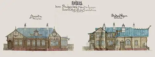 Бревенчатое здание имеет нарядный фасад, удлинённый вдоль улицы. Имеются завершения в виде башенок. Кажущееся увеличение высоты дома достигается за счёт вытянутых проёмов окон. Объёмы здания разной величины отделяются друг от друга криволинейными выпусками брёвен. Верхние части фасадной стороны сруба декорированы резной обшивкой[3][4].