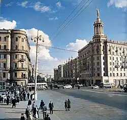 Как и соседнее здание, жилой дом построен в 1940—1944 годах по проекту архитектора А. Г. Мордвинова на месте снесённого в 1934 году храма Димитрия Солунского[1]. По тому же проекту в 1939 году был построен жилой дом на Большой Полянке, 1/2[2]. Крупная проездная арка в доме связывает с Тверской Большой Гнездниковский переулок. До 1958 года на угловой башенке стояла статуя девушки с серпом и молотом (скульптор Г. И. Мотовилов)[3], в связи с чем здание получило обиходное название «дом под юбкой». Существует версия, что моделью статуи послужила балерина Ольга Лепешинская.