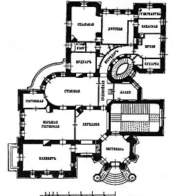В свободной планировке дома использован принцип функциональной взаимосвязи изолированных групп помещений (парадных, жилых, хозяйственных), что характерно для богатых домов начала XX века. Расположение комнат в доме — веером, по ходу солнца, что создавало условия для хорошего естественного освещения[13]. Общая площадь здания составляет 3 309,5 м²[14].