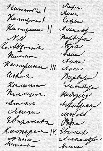 - «Катерина IV» — возможно, Екатерина Николаевна Ушакова[12] (1809—1872) или Екатерина Васильевна Вельяшева (1812—1865), по мужу (с 1834 года) Жандр.