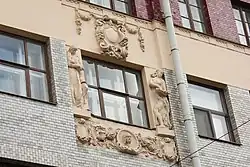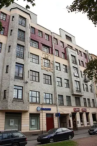 В основе композиции фасада — эркеры (левый — со срезанными углами, на пять этажей, правый — на три этажа[1], со стеклянными дверями с французскими балконами[3]) и горизонтальные выделенные цветом полосы. Цоколь покрыт цементной горизонтально рустованной штукатуркой, почти весь остальной фасад (три этажа, фасады мансардных художественных мастерских и эркеры) облицован светлой глянцевой плиткой производства П. К. Ваулина и О. О. Гельдвейна, пятый и шестой этажи облицованы красно-малиновой плиткой. Несимметричность фасада отражена и во внутренней планировке: на каждом этаже сделано по две шестикомнатные квартиры, но в левой части здания квартиры больше[1]. Во избежание монотонности и в соответствии с внутренней планировкой ширина оконных проёмов различается[3]. Одно из окон оформлено пышным барельефом с картушами, гирляндами и женскими фигурами, аллегориями материнства и образования[4].