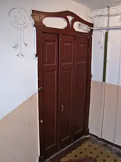 Парадная лестница облицована зелёным мрамором, у неё лепной фриз и кессонированный плафон. У дверных проёмов квартир криволинейные навершия и фигурные прорези, лепнина с цветочными мотивами на потолке[4].