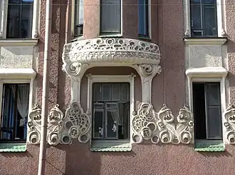 На нижнем этаже сделаны витрины магазинов[4], на верхнем этаже — спланированы художественные ателье, на фасаде проявленные[2] четырьмя трёхгранными[4] стеклянными фонариками. Гигантский фриз сделан мозаикой в технике укрупнённого набора[2] (всего пять панно[4] по эскизам С. Т. Шелкового, выполненные мастерской В. А. Фролова[5]). Три жилых этажа объединены пилястрами и двумя округлыми эркерами. Здание обильно украшено лепными украшениями, в том числе двумя женскими фигурами, сандриками, архивольтами[4].