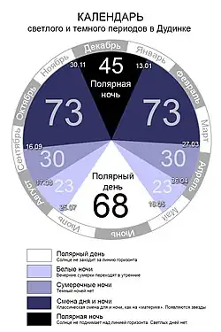 Из-за своего географического расположения на широте в 69 градусов для города характерны полярная ночь и полярный день. Полярная ночь в городе наступает 30 ноября и продолжается 45 суток до 13 января. В этот период светлое время дня составляет всего 2 часа с 12 до 14. Солнце даже в этот промежуток времени не появляется над горизонтом. Полярный день начинается 19 мая и длится 68 суток до 25 июля. В это время солнце не опускается ниже линии горизонта. Далее следует период белых ночей (23 дня до 17 августа) и период сумеречных ночей (30 дней до 16 сентября).