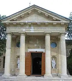 Здание выстроено из бледно-жёлтого ингулецкого известняка, в стиле русского классицизма с четырёхколонным портиком у западного фасада. Завершает строение невысокий купол. В наружных нишах помещены шесть скульптурных изображений святых.