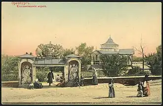 Елизаветинские ворота восстановленный в 2008 году[1] памятник архитектуры. Изначально был установлен в 1757 году в память подавления башкирского восстания 1755—1756 годов против насильственной христианизации в стене Оренбургской крепости. После сноса стен Оренбургской крепости в 1860-х годах ворота перенесли к месту спуска реки Урал. После установления Советской власти был снесен,[2] как символизируюший угнетенение народов и царизм. Восстановлены в 2008 году.[3]