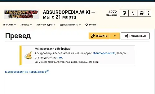 Мягкий редирект с Викия-зеркала Абсурдопедии на перемещённый сайт, использующий отсылку к Бобруйску