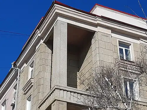 В выделенных пилястрами и рустовкой углах основных объёмов, закреплённых колоннами с квадратным сечением, находятся угловые лоджии в два этажа высотой.