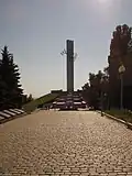 Аллея Славы от мемориального камня и до начала лестницы вымощена камнем-брусчаткой. Брусчаткой вымощена и смотровая площадка у основания пилонов. Брусчатка — как символ. На брусчатке Красной площади Москвы 7 ноября 1941 года военным парадом в честь 24-й годовщины Великого Октября начался трудный долгий путь к Победе, закончившийся на брусчатке улиц Берлина 9 мая 1945 г. Крупная массивная округло-выпуклая брусчатка непривычна и неудобна посетителям мемориала, но она реально создаёт ощущение нелёгкого пути к Победе. Камень-брусчатку завозили с улиц Астраханская и Рабочая, где ещё до 1917 года его укладывала бельгийская фирма. Потребность в брусчатке для мемориала — основная причина демонтажа каменного покрытия и асфальтирования этих улиц в 1980—1982 годах.