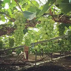 Незрелый александрийский мускат в Японии - Мускат александрийский (дзибиббо) — гибрид белого муската с почти исчезнувшим ныне греческим сортом Аксина (исп. Axina de Tres Bias)[5], дающий более крупные грозди и ягоды овальной формы[3]. Хотя ягоды обладают интенсивным и весьма своеобразным ароматом (следствие обилия гераниола), получаемые из них вина обычно менее насыщенны, чем вина из белого муската (что может быть объяснено как величиной ягод, так и склонностью кустов давать избыточный урожай)[3]. Наиболее распространён в Испании (под названием Moscatel), также культивируется в США, ЮАР, России, Тунисе и многих других странах. Среди самых уважаемых вин из этого сорта винограда — насыщенные сладкие вина категории «аппассименто» с островов Пантеллерия и Лемнос. Не считая упомянутых ниже мускатов, из многочисленных потомков этого сорта наибольшие площади занимают аргентинские торронтес и сереса, а также сицилийский грилло (гибрид с катарратто, дающий большинство марсальских вин).