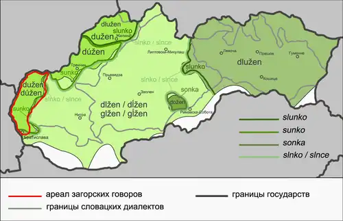Ещё одна древняя диалектная черта выделила часть празападнословацких говоров, на основе которых развились современные загорские, а также верхнетренчинские и нижнетренчинские говоры, и все говоры правосточнословацкого диалекта, которые обособились от остальных празападнословацких и всех прасреднесловацких говоров в результате того, что в них сохранились сочетания язычного согласного и редуцированного с плавным l, изменившегося впоследствии в сочетание lu (dluh, slunko), в то время как в прасреднесловацком и празападнословацком (без северных и крайне западных говоров) диалектах в данных сочетаниях развились слоговые (dl̥h, sl̥nko)[8].