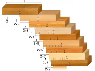 Поставить друг на друга одинаковых твёрдых прямоугольных параллелепипедов, собрав устойчивую башню на краю стола таким образом, чтобы выступ за край был максимален.
