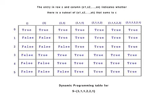 Алгоритм строит таблицу размера на n, содержащую значения рекурсии, где — сумма значений, а — число элементов. Когда вся таблица заполнена, возвращаем . Ниже приведена таблица P. На рисунке синяя стрелка из одного блока в другой, если значение конечного блока может зависеть от значения исходного блока. Эта зависимость является свойством рекуррентного отношения.