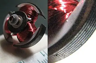 Это ротор от двигателя постоянного тока диаметром примерно 20 мм, используемого в проигрывателях компакт-дисков. Для снижения паразитных индуктивных потерь сделано расслоение полюса электромагнита на части.
