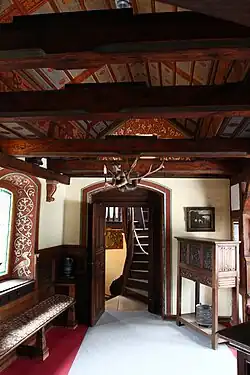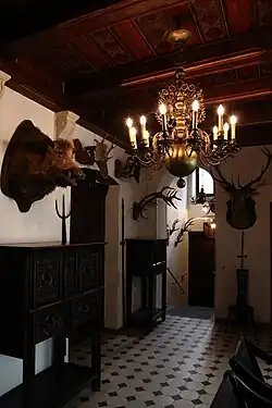 Это помещение соединяет строения вокруг главной башни со строениями, расположенными по внутреннему периметру замка. Потолок украшает люстра в форме русалки — в Средние века её фигура являлась символом защиты от злых духов. Наверху, на балке, написана пословица, советующая окружать себя не только предметами, приносящими пользу, но и предметами искусства. Винтовая лестница ведет в охотничью комнату.