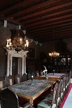 В этом зале стены, двери и мебель украшены оригинальной резьбой по дереву. Из мебели особенно выделяется массивный буфет (мебель) высотой 5,0 и шириной 4,5 м, украшенный резьбой и интарсиями. Потолок перекрыт балками и украшен рисунками (исполнены выжиганием, затем расписаны). В мотивах рисунков потолка доминирует имперский двуглавый орёл. Стены богато украшены орнаментом и выложены высокой плиткой с изображением сцены распятия Христа и символических фигур верности (Фидес) и любви к ближним (Каритас). В угоду Ренессансу с правой стороны буфета встроена дверь, через которую нельзя ни выйти, ни войти, так как в стене нет дверного проёма.