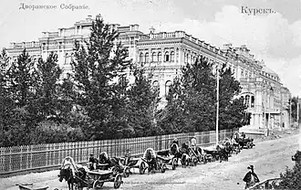22 ноября (5 декабря) 1914 года Николай II, следуя на Кавказ в действующую армию, сделал остановку в Курске[39] и посетил один из военных госпиталей, располагавшийся в здании Дворянского собрания и рассчитанный на 75 офицеров и военнослужащих нижних чинов (попечительницей этого госпиталя была жена предводителя дворянства Курской губернии Н. В. Дондукова-Изъединова)[40]. К приезду императора в верхней части фасада Дворянского собрания был вывешен вензель «Н II А», располагавшийся под изображением короны Российской империи[16][32].