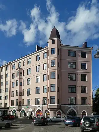 Построенное в 1903 году пятиэтажное здание акционерного общества «Арина» обращено к площади фасадом, выделяющимся двумя небольшими эркерами (один из которых получил купольное завершение) и облицованными горшечным камнем готическими витринными окнами первого этажа, в оформлении которых просматривается связь со стилистическими приёмами, использованными при строительстве павильона Финляндии на Всемирной выставке в Париже. Первый этаж предназначен под коммерческие цели, а верхние этажи с окнами разного размера отводились под 8 больших квартир, сгруппированных у оригинальной лестничной площадки овальной формы. Лестничная спираль с узорными перилами закручивалась вокруг лифта. Жильцами стали зажиточные горожане: например, в квартире № 2 поселился владелец шляпной фабрики, а на первом этаже у него был магазин[3].