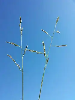 Метёлка рыхлая, с шероховатыми ветвями, 4—10 см длиной и 1,5—3,5 см шириной, с 10—25 колосками. Колоски 3—5-цветковые; колосковые чешуйки неравные: верхняя около 4 мм длиной, почти вдвое длиннее и шире нижней. Прицветные чешуйки желтовато-зеленоватые, реже на верхушке слегка фиолетово-покрашенные, у нижнего в колоске цветка 5—6 мм длиной; наружная почти одинаковой длины с внутренней или немного длиннее, с короткой остью — 0,5—1,5 мм длиной. 2n=40.