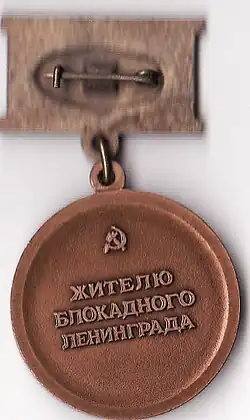 Круглая латунная медаль диаметром 27 мм; на лицевой стороне — изображение разорванного кольца на фоне Главного Адмиралтейства, язык пламени, лавровая ветвь и надпись «900 дней — 900 ночей»; на оборотной — серп и молот и надпись «Жителю блокадного Ленинграда».