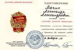 Удостоверение к знаку Ударник 9-й пятилетки, 1975 г.