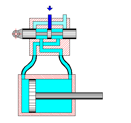 В простейшем случае золотник может занимать 3 позиции. В нейтральном положении, показанном на рис. 1, каналы распределителя заперты и жидкость не поступает от насоса ни в одну из полостей гидроцилиндра — шток остаётся в покое. При смещении золотника влево рабочая жидкость по каналам в корпусе распределителя и по трубопроводам поступает в левую полость гидроцилиндра, и шток выдвигается. Если же золотник сместить вправо от нейтрального положения, то рабочая жидкость будет поступать уже в правую полость гидроцилиндра, а из левой полости пойдёт на слив в гидробак. В этом положении золотника шток вдвигается.