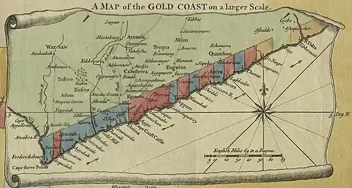 В 1672 году образовалась английская королевская Африканская компания, которая построила и укрепила ряд пунктов около голландских и построенных между тем датских фортов. При этом англичане, голландцы и датчане платили за занимаемую ими землю вождям племен.