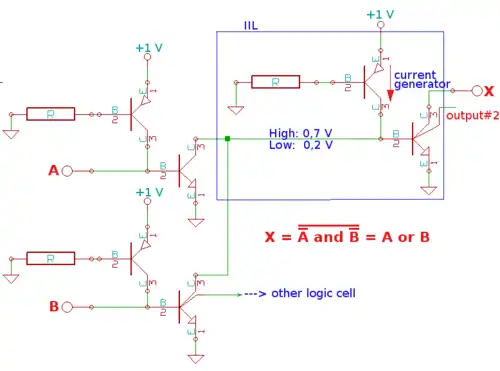 - Хотя логические уровни ИИЛ очень близки (логический ноль ~0,2 В, логическая единица ~0,7 В) схемы ИИЛ имеют высокую помехоустойчивость, поскольку логические уровни передаются током, а не напряжением.