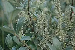 Почки яйцевидные, жёлто-бурые, в начале густо-, позже, рассеянно-волосистые. Прилистники мало развитые, косые, яйцевидно-ланцетные. Листья обратнояйцевидно-ланцетные или продолговато-обратнояйцевидные, к обоим концам суженные или спереди округлённые в основании клиновидные, цельнокрайные, сверху густо-серо-волосистые, снизу сизоватые, длиной 3—6 см, шириной 1,2—2,8 см, на черешках длиной 2—7 мм.