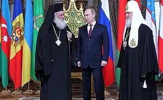 Архиепископ Иероним II, Владимир Путин и патриарх Кирилл. Москва, 2012 год