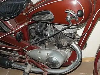 На мотоцикле установлен одноцилиндровый, двухтактный двигатель воздушного охлаждения с возвратно-петлевой двухструйной продувкой, с приготовлением рабочей смеси в карбюраторе и воспламенением её в цилиндре от электрической искры[4]. Коленчатый вал — сборный, прессованный. Картер — блочного типа. В передней части находится кривошипная камера, в задней размещена коробка передач. Картер состоит из двух половин с разъёмом по средней продольной плоскости. Педаль ножного переключения передач и педаль кикстартера расположены с левой стороны картера коробки передач.