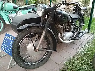 Переднее колесо вместе с тормозом, приводным редуктором спидометра и грязевой щиток крепятся к подвижной части телескопической вилки. На вилке укреплена фара, в корпусе которой вмонтирован спидометр, соединённый гибким валом с редуктором. Руль мотоцикла закреплён в кронштейнах верхнего мостика телескопической вилки, поворачивающейся на 35° в обе стороны. При этом руль может быть закреплён в удобном для водителя положении.
