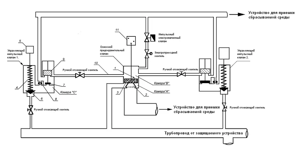 Управляющие импульсные клапаны 1 и 2 в рабочем состоянии закрыты под действием пружины (4) и дополнительной силы прижатия, создаваемой электромагнитом (5). Импульсные клапаны 1 и 2 состоят из полнопроходного предохранительного клапана с пружиной (4) и управляющего элемента, выполненных в одном корпусе. При превышении давления уставки срабатывает датчик и отключает питание электромагнитов. При этом снимается дополнительное усилие, прижимающее конус (6) клапана, и клапан остается прижатым к седлу под действием пружины (4). При дальнейшем росте давления конус (6) поднимается вверх и открывает доступ пара в камеру «С» под отсечной плитой (7) управляющего элемента. Отсечная плита (7) поднимается вместе с золотником (9) управляющего элемента и открывает линию разгрузки (10) основного клапана. Основной клапан открывается.