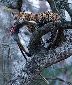 Рацион индийского леопарда достаточно разнообразен[2]: аксис, индийский замбар, нильгау, кабан, гульманы, темношеий заяц, индийский павлин.[19]