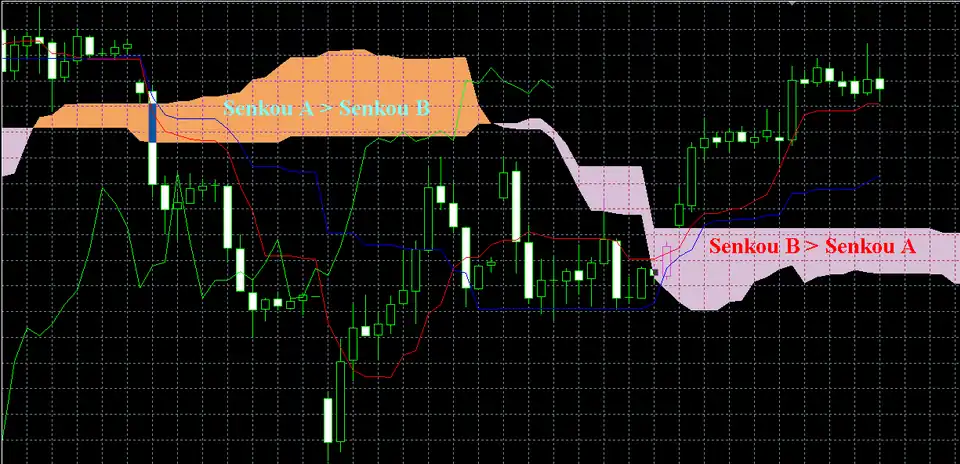 - Синим, если Senkou B находится выше Senkou A.