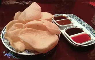 Важную роль в кухне большинства индонезийских регионов играет крупук (индон. krupuk) — чипсы, изготовляемые из крахмала, рисовой, пшеничной, саговой или иной муки, тапиоки, измельчённых сушёных морепродуктов, рыбы, овощей или сухофруктов. Эти и другие исходные продукты могут использоваться в чистом виде либо же смешиваться в различных пропорциях. Наиболее распространены рисовый и креветочный крупук (последний может быть как чисто креветочным, так и креветочно-мучным). При этом отдельные разновидности крупука могут иметь собственные названия. Так, крупук мелких размеров обычно называется крипи́к — он может готовиться из всех тех же продуктов, что и обычный крупук, однако чаще бывает фруктовым или овощным. Крупук с добавлением тёртого либо дроблёного арахиса называется ремпейе́к[64], приготовленный из тёртого ореха мелинжо — эпми́нг[65].