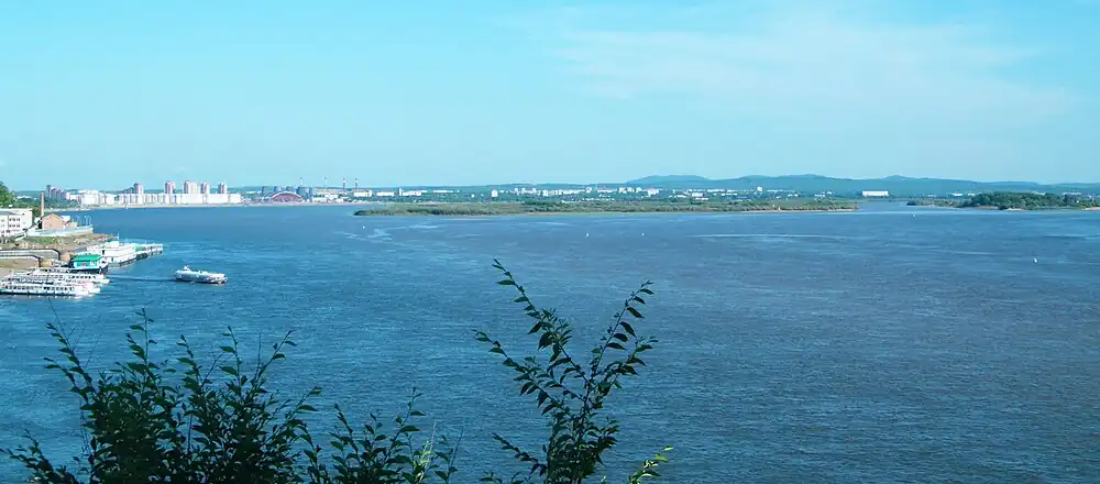 слева направо: Прибрежный микрорайон; микрорайон "Строитель"; строящаяся Арена «Ерофей»; ТЭЦ-1; мелькомбинат; Южный микрорайон; судостроительный завод; на Большом Уссурийском острове - пос. Уссурийский (Чумка)