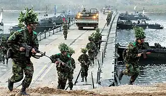 Учение по инженерному обеспечению — развёртывание понтонного моста для переброски войск.